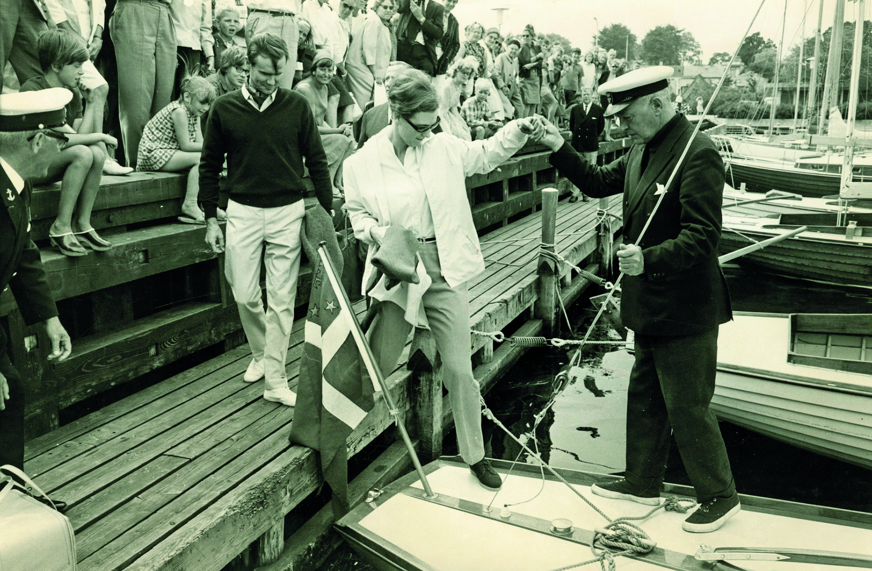 Royalt besøg i lystbådehavnen i Skovshoved Havn i 1967: Margrethe og Henrik skal på sejltur, og havnefoged Hjalmar Houborg er galant og giver Margrethe en hjælpende hånd ombord.