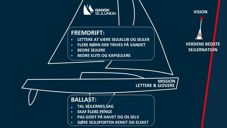 Danmark vil være verdens bedste sejlersportsnation, hvor alle kan udleve deres sejlerdrømme hele livet i åbne, inspirerende og ansvarlige fællesskaber.