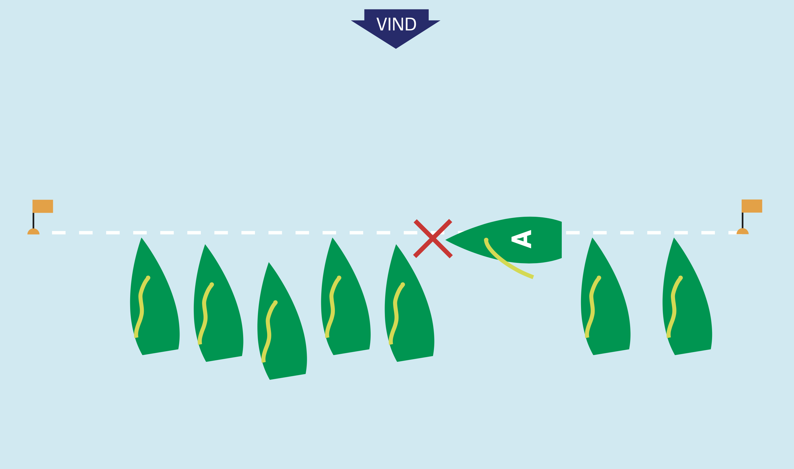 Båden A må ikke tiltvinge sig plads (luv/læ-regel), men må erkende den ufordelagttige situation og søge ned bag linjen – eller blive tvunget til en tyvstart med de følger, det har.