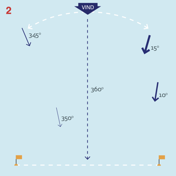Selvom gennemsnitsvinklen er 360°, kan der sagtens ligge forskellige vindvinkler og vindtryk rundt på banen. Dem kan man finde ved at have været rundt på banen inden start.