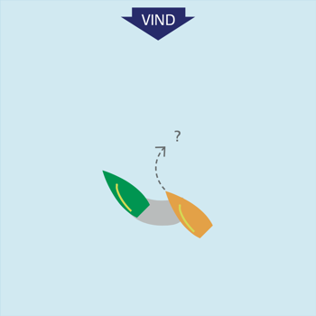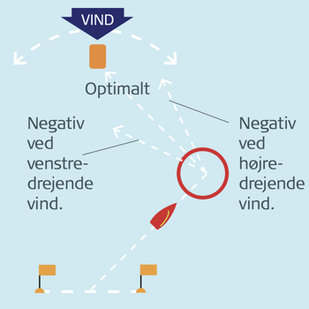 I den røde cirkel helt ude på fløjen vil en vinddrejning til venstre gøre, at du nu er på den forkerte side og har langt til mærket, og en vinddrejning til højre, at du har sejlet for langt og skal falde af til mærket.