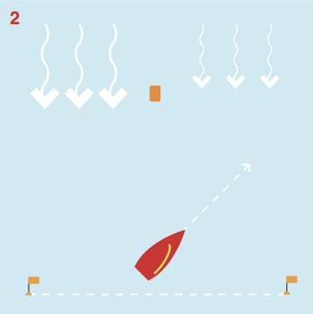 Strømmen kan have stor betydning for, hvordan en bane skal sejles. Find et fast mærke og se, hvad vej og hvor stærkt strømmen løber. Strøm løber stærkere på dybt end på lavt vand.