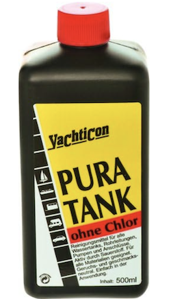 Til vandtanken kan man f.eks. bruge PURA TANK, som renser drikkevandssystemet sikkert og grundigt, ved hjælp af aktivt ilt, og er lugt og smagsneutral.
