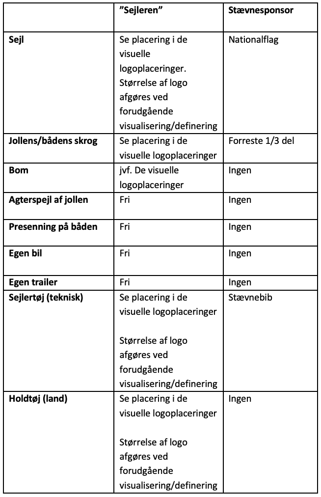 De eksponeringsflader på jolle, sejl, udstyr og beklædning, som ikke er nævnt i denne tabel, skal være fri for sponsor-eksponering og tilhører Dansk Sejlunion.