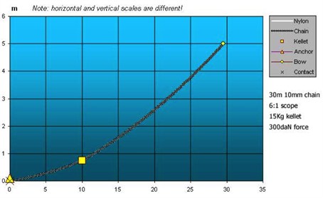 Vi antager, at vi har en 12 meter (40 fod) båd og simulere en 15 kg ankervægt. En 15 kg ankervægt er faktisk en del tungere end de fleste vil anvende (NB: forskellen mellem et objekts vægt over/under vand er ikke medtaget her. I simulationen antager vi, at den vejer 15kg under vand. Dette betyder, at dens vægt over vand må nødvendigvis være endnu større). Vi antager endvidere, at vi har et kædelængde/vanddybde forhold af 6:1, og at resten af ankringsgrejet består af 10 mm kæde.