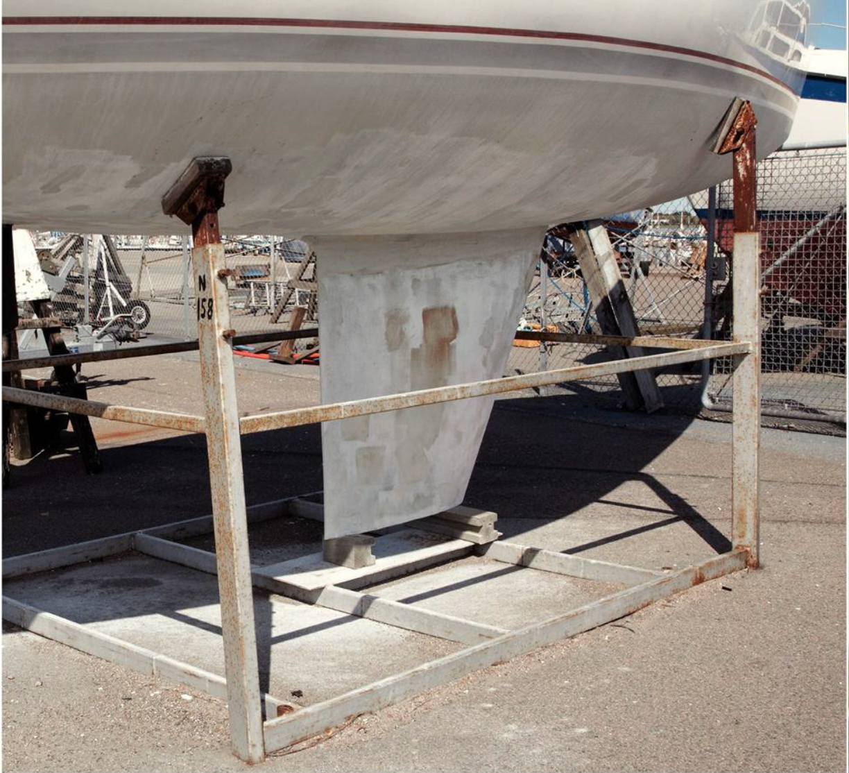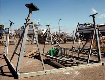 Dette er et fast, svejset stativ, hvor de agterste støtter passer fint, mens de forreste støtter primært afstiver båden sidevers. De burde have peget mere skråt ind på båden. Nu hviler båden rigeligt på især forkanten af kølen. Der mangler også diagonale afstivning på dette stativ.