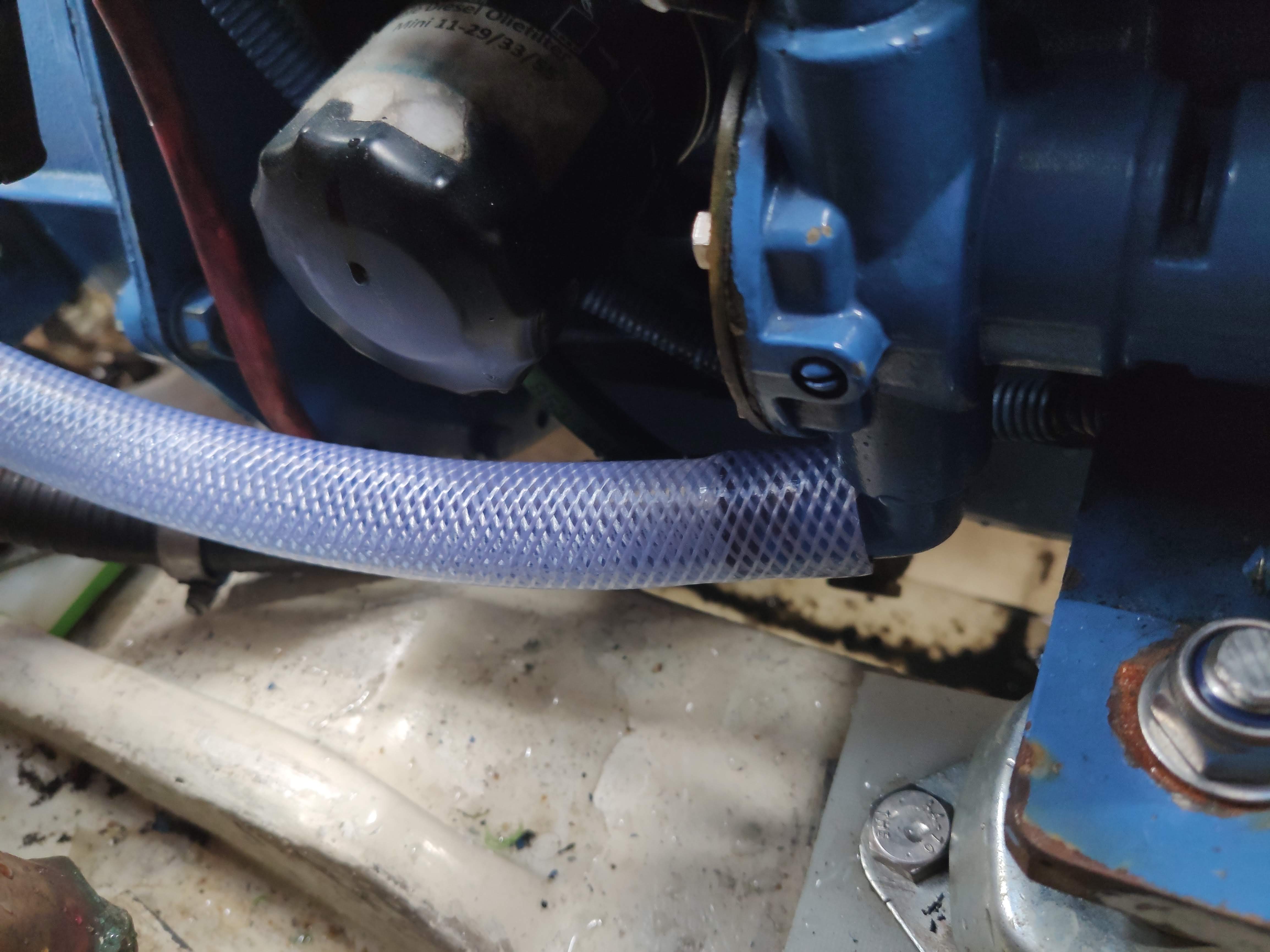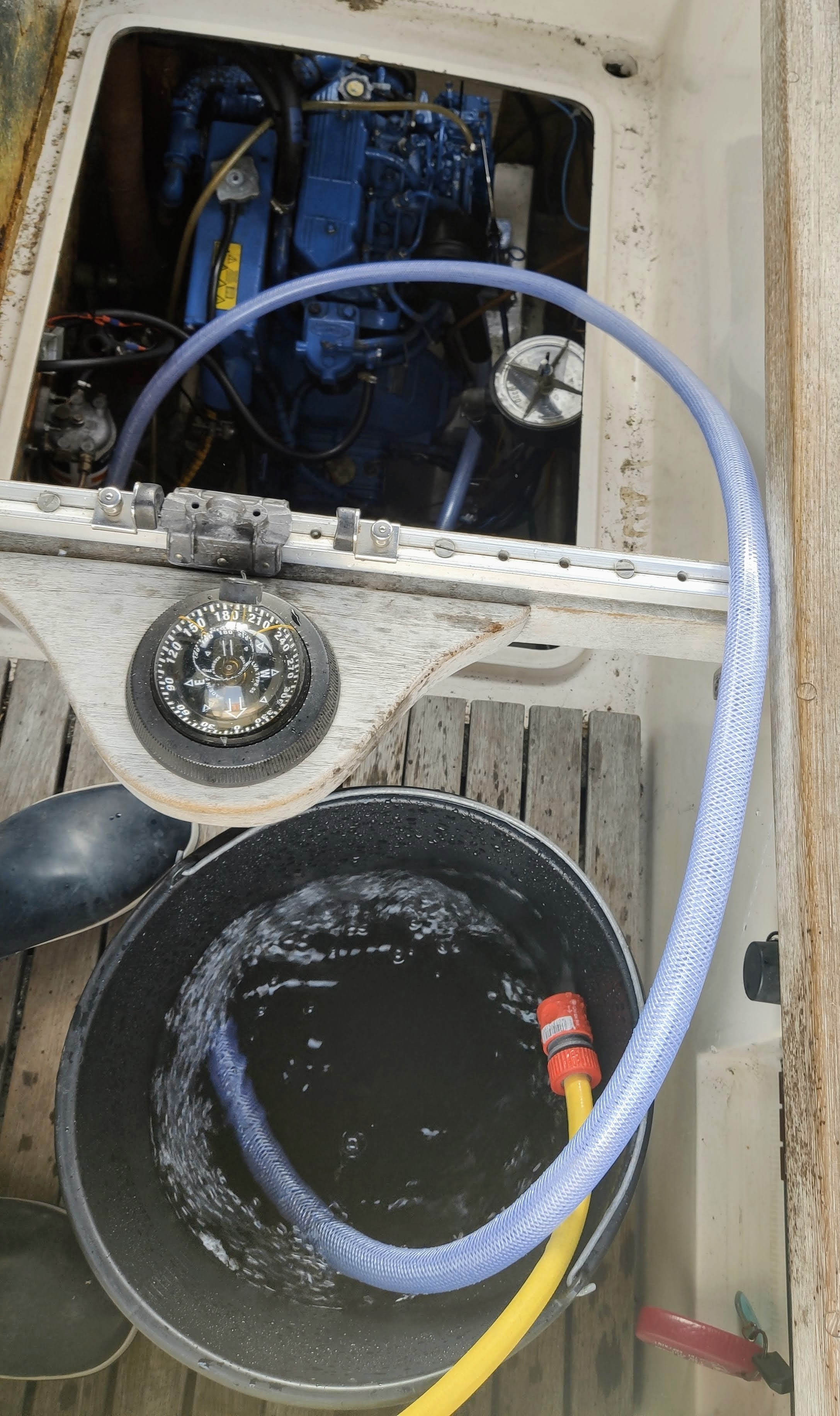 Lokaliser hvor motoren tager saltvand ind og følg slangen til motoren. Den er sikkert afbrudt af et søvandsfilter på vejen. Tag slangen af enten direkte ved motoren eller ved søvandsfilteret. Sæt nu en slange på, som er lang nok til, at den kan nå en spand med vand. Motoren kan jo ikke suge kølevand fra havet, så vi fodre den i stedet med med rent ferskvand fra spanden. Du skal hele tiden have en vandslange til at løbe i spanden, for motoren tømmer den lynhurtigt, hvis den ikke konstant efterfyldes.