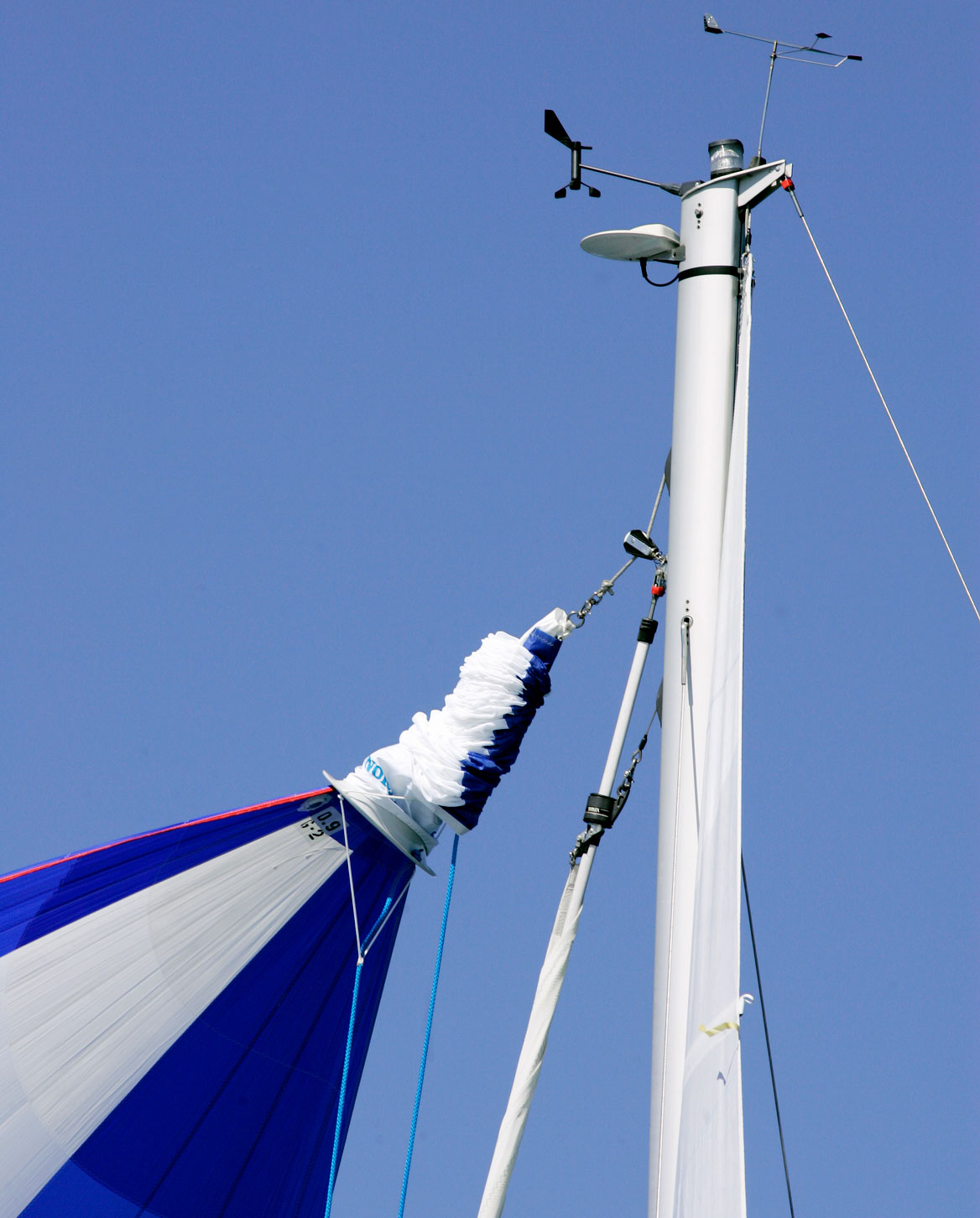 På mange turbåde kan du have en fastmonteret tackline (den blå), der skal holde gennakeren fri af pulpitten.