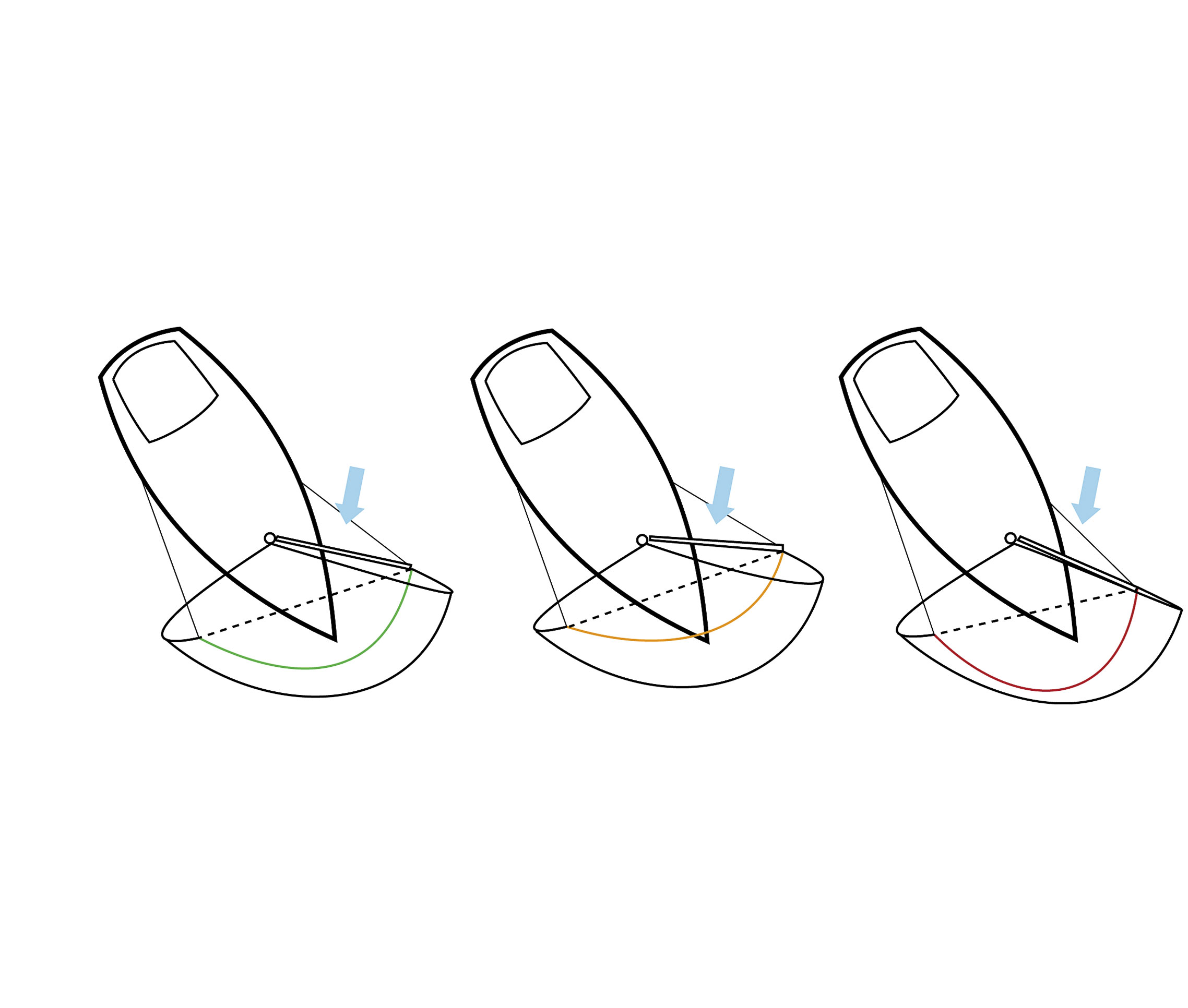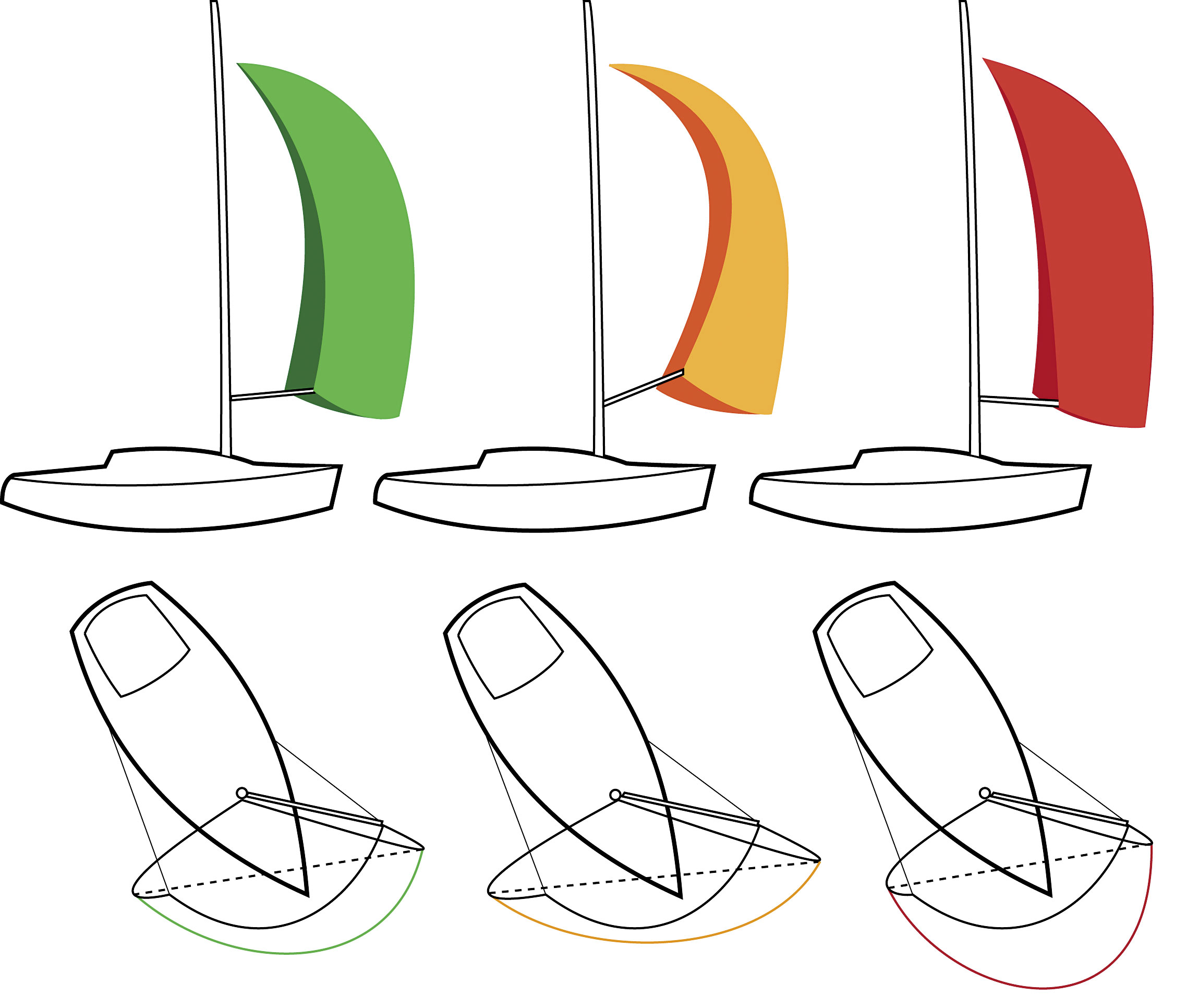 Stagen står korrekt på grøn spiler. Spileren bliver fladere forneden med stagen mere agterover (orange) og dybere nederst med stagen mere fremad (rød).