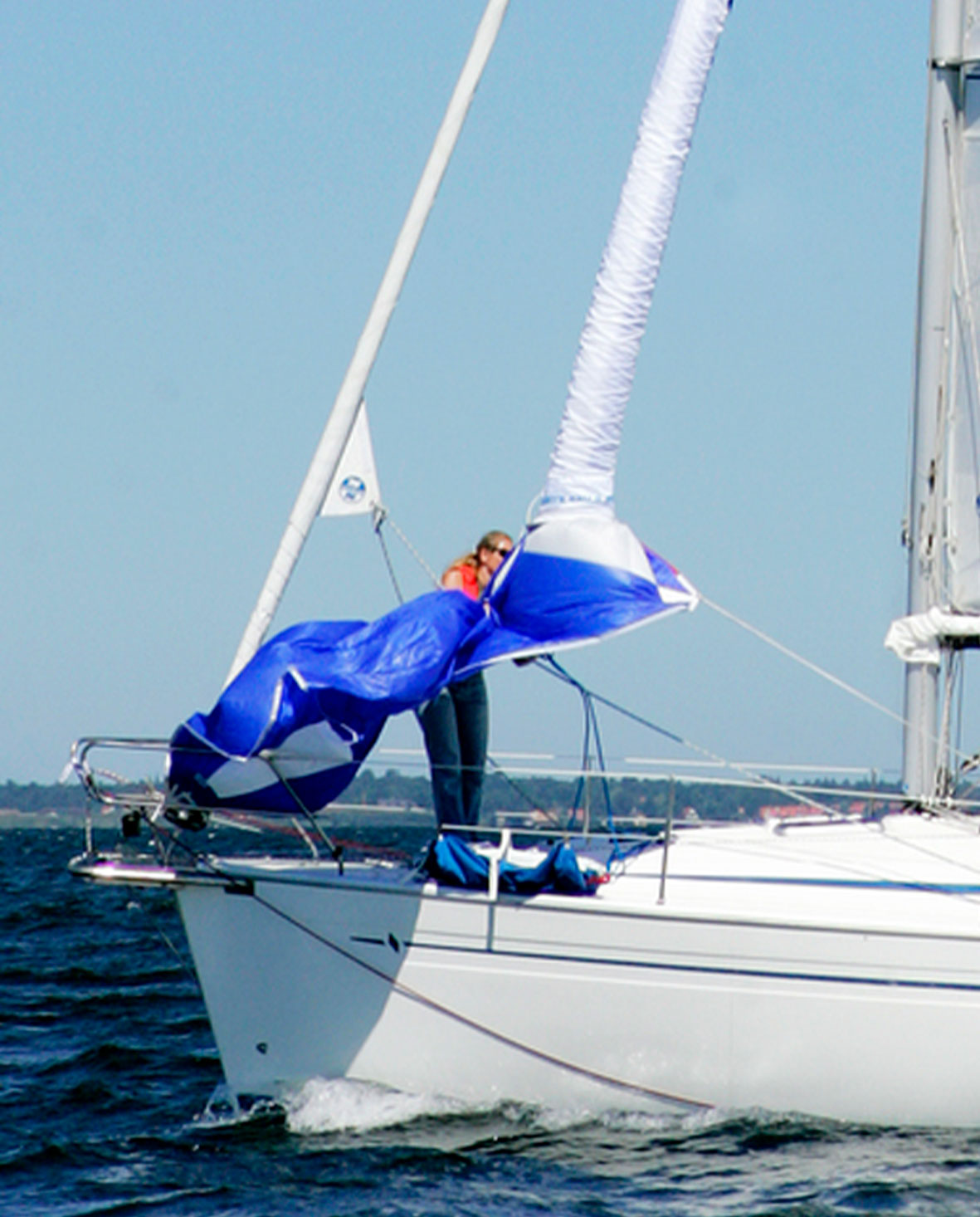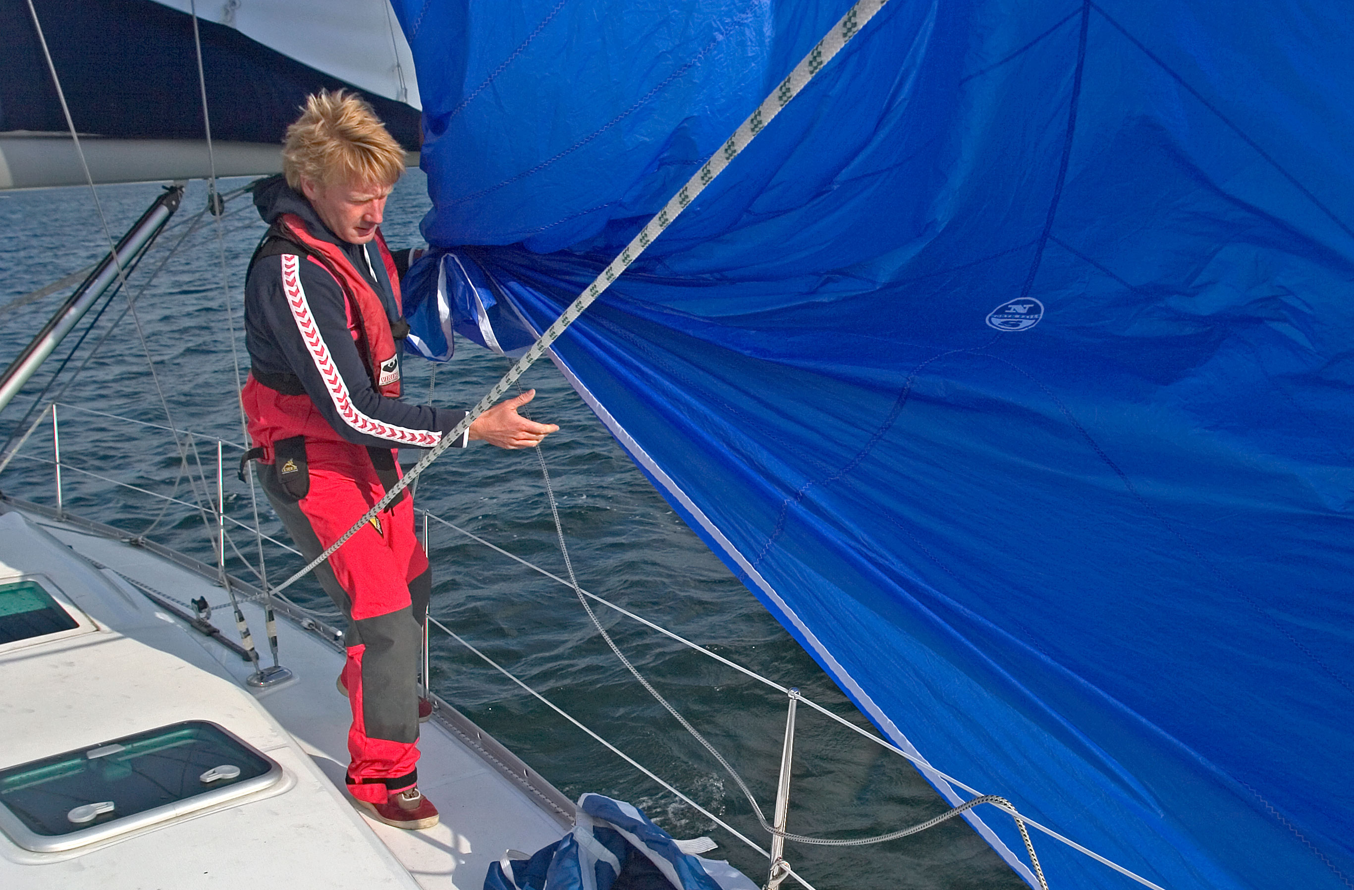 Gennakere er normalt nemme at tage ned. Når du kan falde næsten ned til plat læns. Så er sejlet næsten ”håndtamt” i læ af storsejlet.