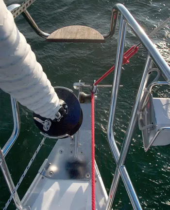 Det kan være en fordel at have tacklinen (den røde) i en blok i stævnen, så gennakeren kan justeres og er nemmere at bjærge.