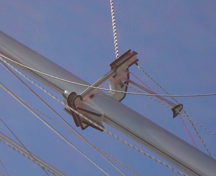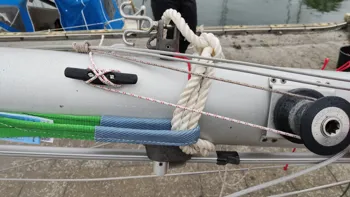 Metode 3: Ofte er salingshornene sat, så de kan fungere som løftepunkt. Et (blåt) reb er bundet i løftestroppen, så den er nem at trække ned, når masten står fast.