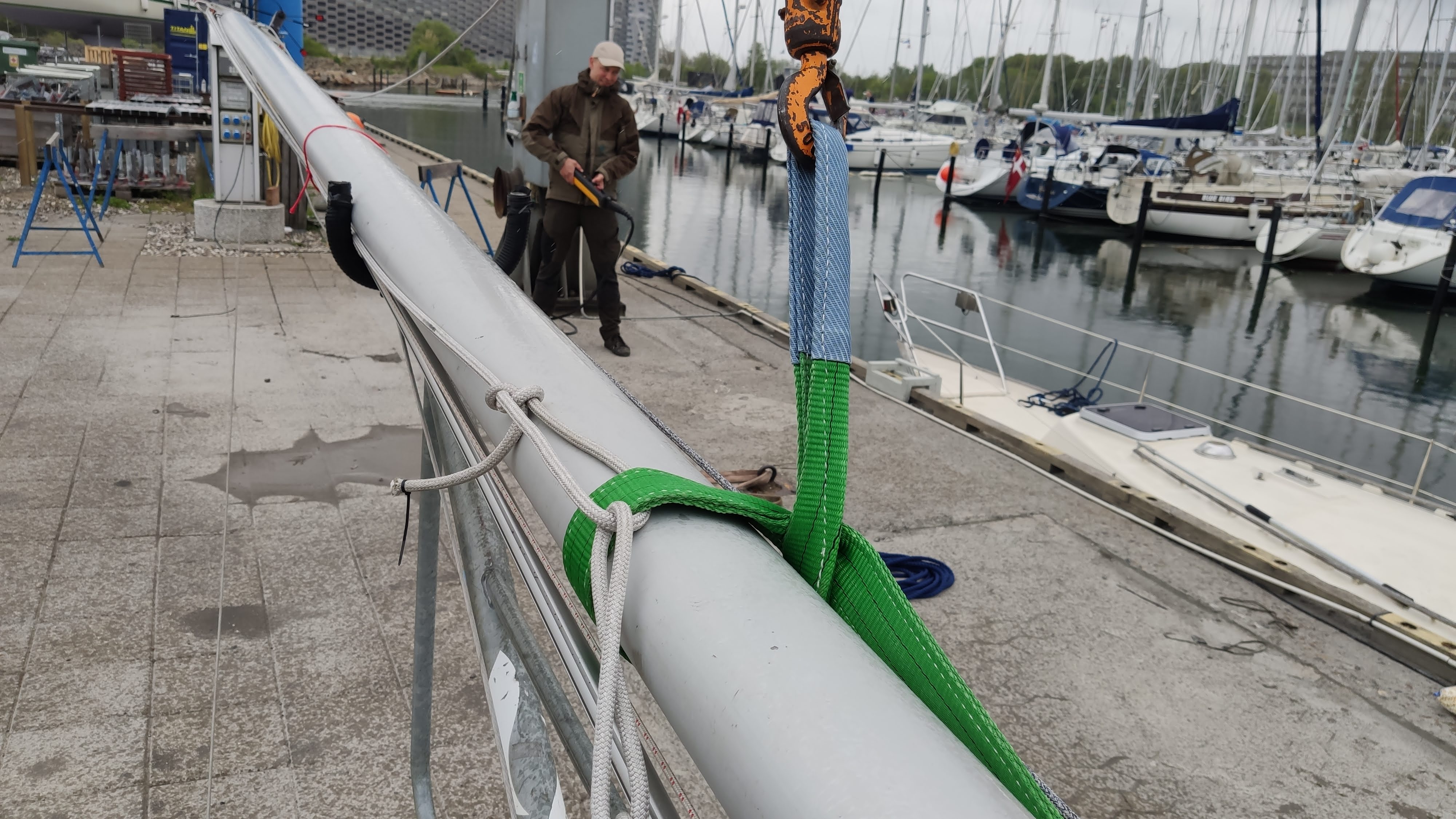 Stroppen er lagt om masten og sallingshornene fungerer som løftepunkt.