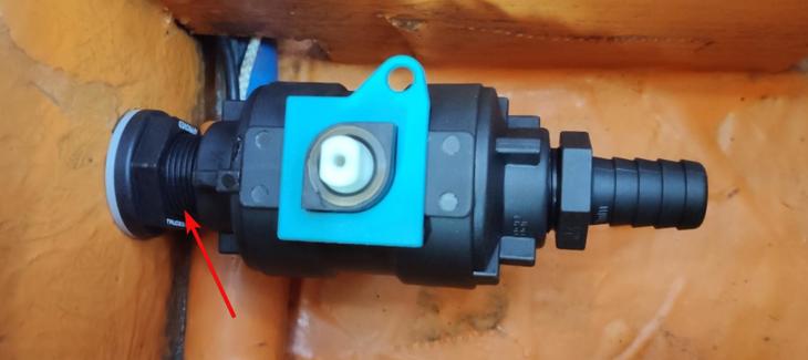 Her skal du være opmærksom på overskydende gevind (se pilen). Ventilen får den største styrke, hvis den kan spændes helt op til skroggennemføringen. Her er gennemføringen lidt for lang.