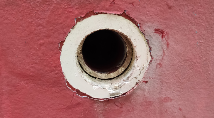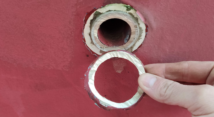 Det kan godt være, at du må bruge lidt kræfter, hvis skroggennemføringen holdes fast af fugen i hullet, men den skal nok komme fri og kan nu nemt fjernes fra indersiden.