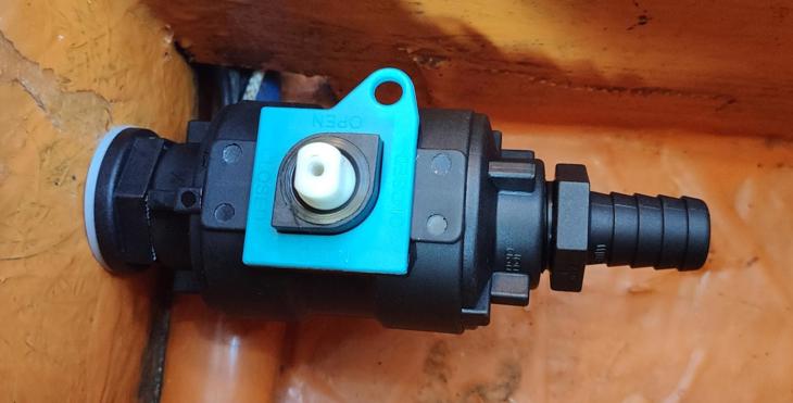 Håndtaget på ventilen er midlertidigt afmonteret for nemmere at at få plads til at skrue den på skroggennemføringen.
