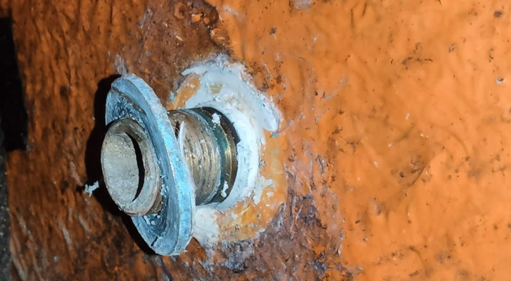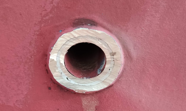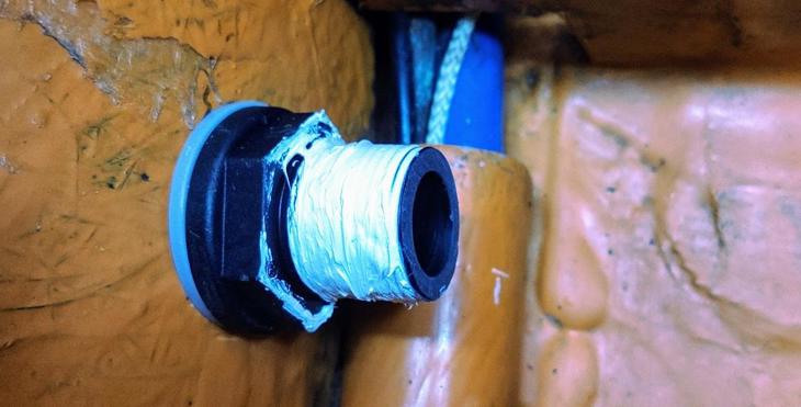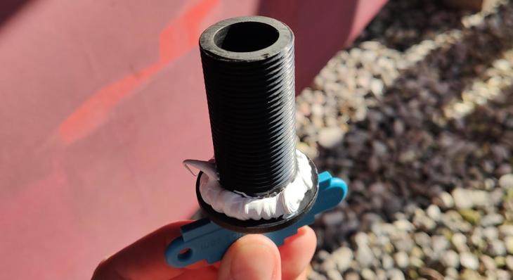 Nu er alt klar til at gøre skroggennemføringen endeligt fast. Vælg en fuge der er godkendt til brug under vandlinjen og læg en ring på kappen.
