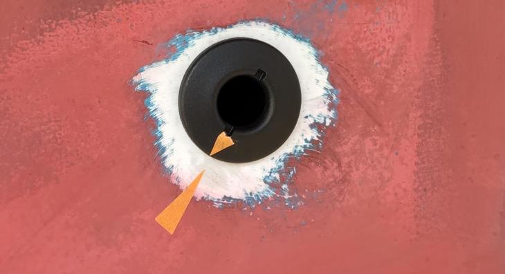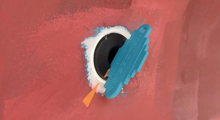 Når alt er drejet på plads og tilpasset på indersiden, kan du på ydersiden sætte et mærke på skroggennemføringen. Det er vigtigt at skroggennemføringen sidder på samme måde, når du laver den endelige installation. Hvis den bliver drejet en halv omgang risikerer du, at ventilen og dermed håndtaget også roterer og ikke kommer til at sidde hvor det skal.