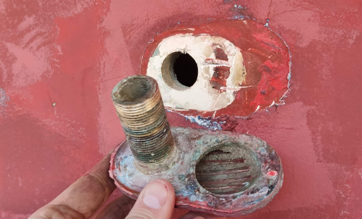 Begynd med at løsne ventilen fra skroggennemføringen. Her er rørtænger og store svensknøgler det rigtige værktøj.