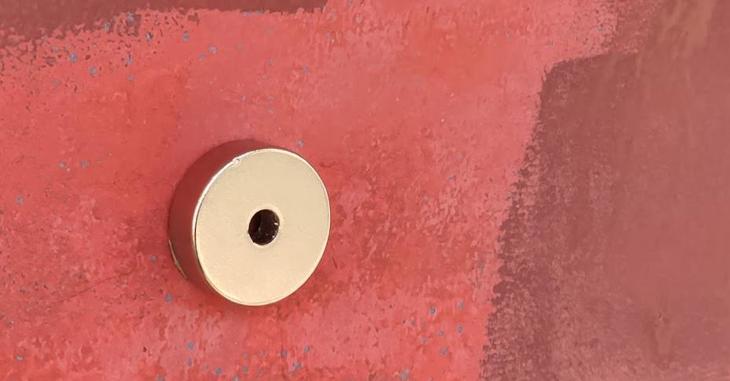 Den ene magnet sættes på indersiden, der hvor ventilen skal side. Den anden magnet sættes på ydersiden og 'fanger' nemt magneten på indersiden. Nu kender du placeringen af hullet på begge sider. Denne metode gør det også muligt at bore fra ydersiden og være sikker på hvor hullet kommer på indersiden. Før du borer det store hul, er det altid en god ide at lave et pilothul med et lille bor - bare for at være helt sikker på placeringen.