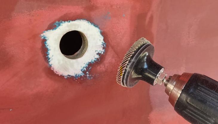 Tætningsfugen kan ikke hæfte på den porøse bundmaling. Derfor skal der slibes rent rundt om hullet. Du skal slibe ind til primeren til alt bundmaling er væk. Derefter tørrer du området af for støv. Det er nemt at gøre i hånden med sandpapir eller med en lille slibeskive.